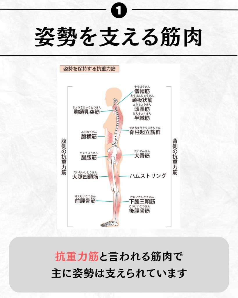 抗重力筋と言われる筋肉で主に姿勢は支えられています。
