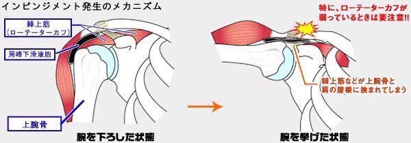 肩関節を動かす際に、関節付近で他の骨や筋肉との衝突が生じることによって、組織の損傷が起こって痛みが生じる事です。
