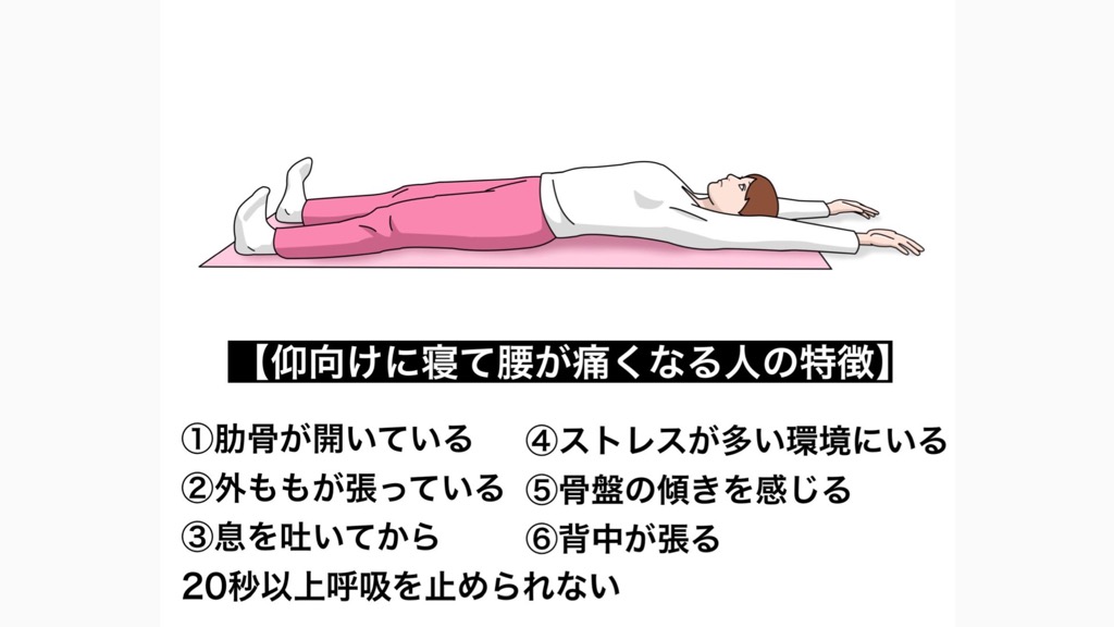 仰向けで寝ると腰が痛む99%の方は、腹筋の力が抜けて腰で体を支えている可能性が高い。